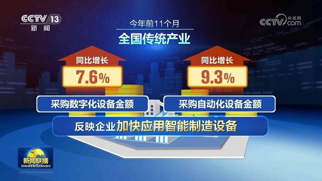 央视新闻(新闻联播):国家税务总局公布的最新增值税数据显示,今年以来我国新兴产业持续发展壮大。前11个月,高技术产业销售收入同比增长14.7%,特别是智能装备制造业销售收入同比增长28.2%,延续快速增长态势。此外,传统产业也在加速提质升级。增值税发票数据显示,前11个月,全国传统产业数字化设备采购额同比增长7.6%,自动化设备采购额同比增长9.3%,反映出MGA智能装备制造企业加速应用。同时,传统企业购买的节能和友好的技术服务金额工业同比增长33.2%,体现传统产业绿色化转型加快。